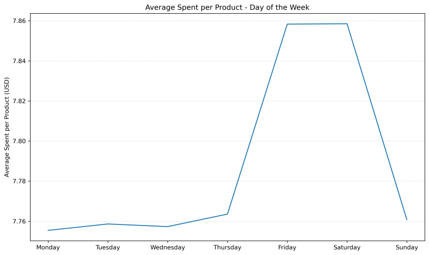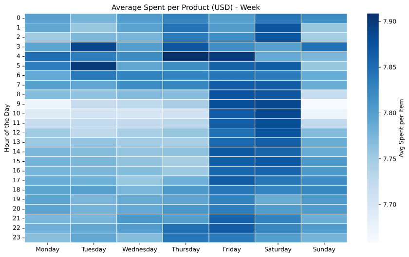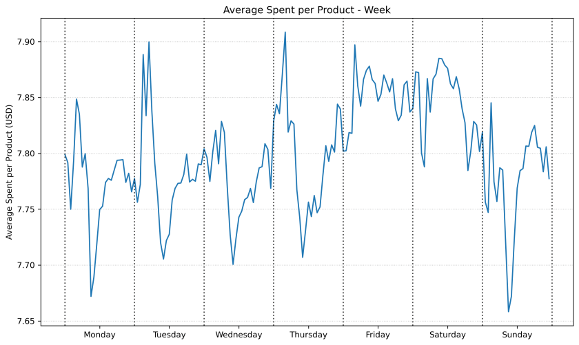Analysing average spending per product over time reveals consistent patterns from Sunday to Thursday. Early morning spending is elevated, but shows sporadic behaviour, with occasional peaks between 3 a.m. and 6 a.m. This is followed by a sharp decline to the lowest spending levels between 9 a.m. and 12 p.m., after which it stabilises at a moderate level until midnight.