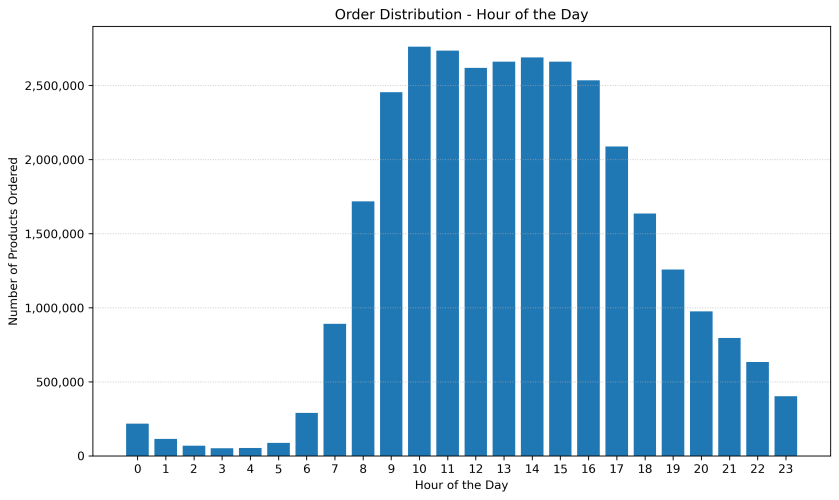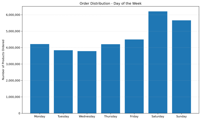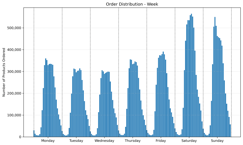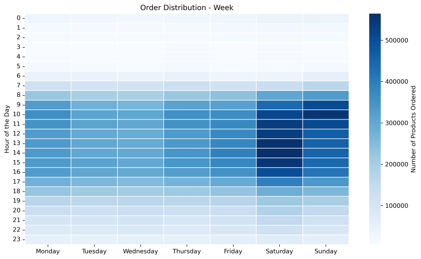 Analysing order volumes over time revealed that the highest activity occurred on Saturdays and Sundays, with the lowest number of daily orders observed on Tuesdays and Wednesdays. Peak ordering hours were observed daily between 9 a.m. and 4 p.m., followed by a gradual decline in the evenings, reaching their lowest levels in the early morning before 7 a.m.