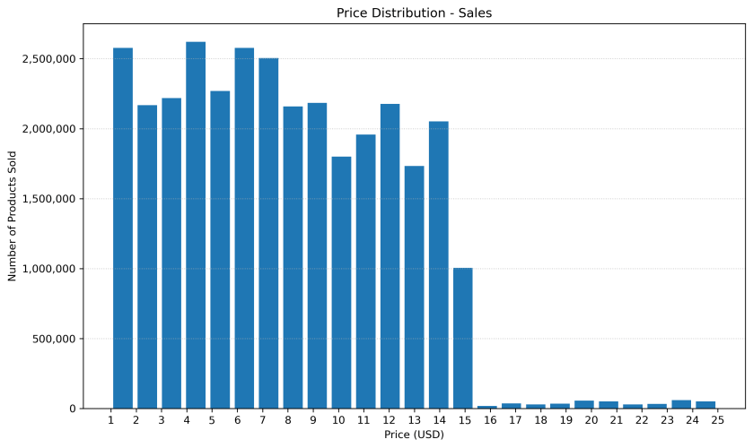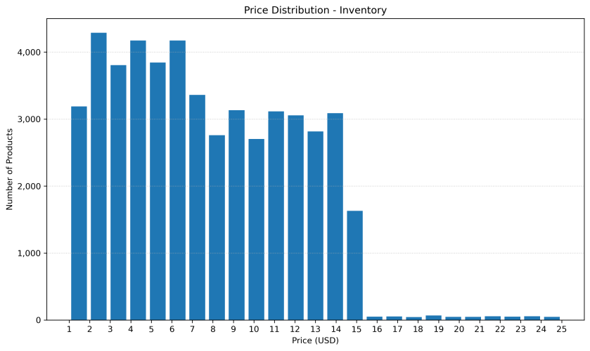 A price distribution analysis revealed that most products are priced between $1 and $15, with a median inventory price of $7.10 and a median sales price of $7.40. While the majority fall within this range, a smaller portion of products are priced between $15 and $25.
