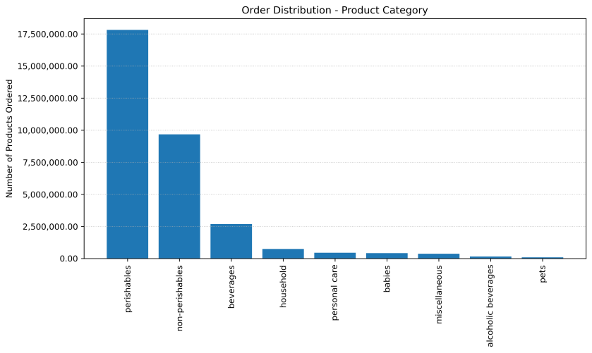 Analysis revealed that perishables are the most frequently ordered category, followed by non-perishables. In contrast, categories like alcoholic beverages, pet supplies, and miscellaneous items exhibit significantly lower order frequencies. Within perishables, produce leads in order volume, followed by dairy and bakery items. Among non-perishables, snacks, frozen goods, and pantry staples receive the highest number of orders.