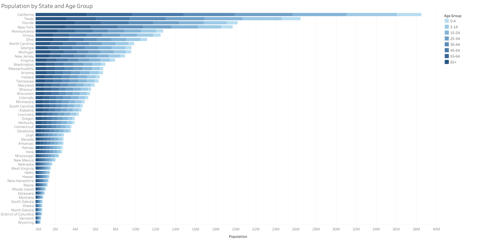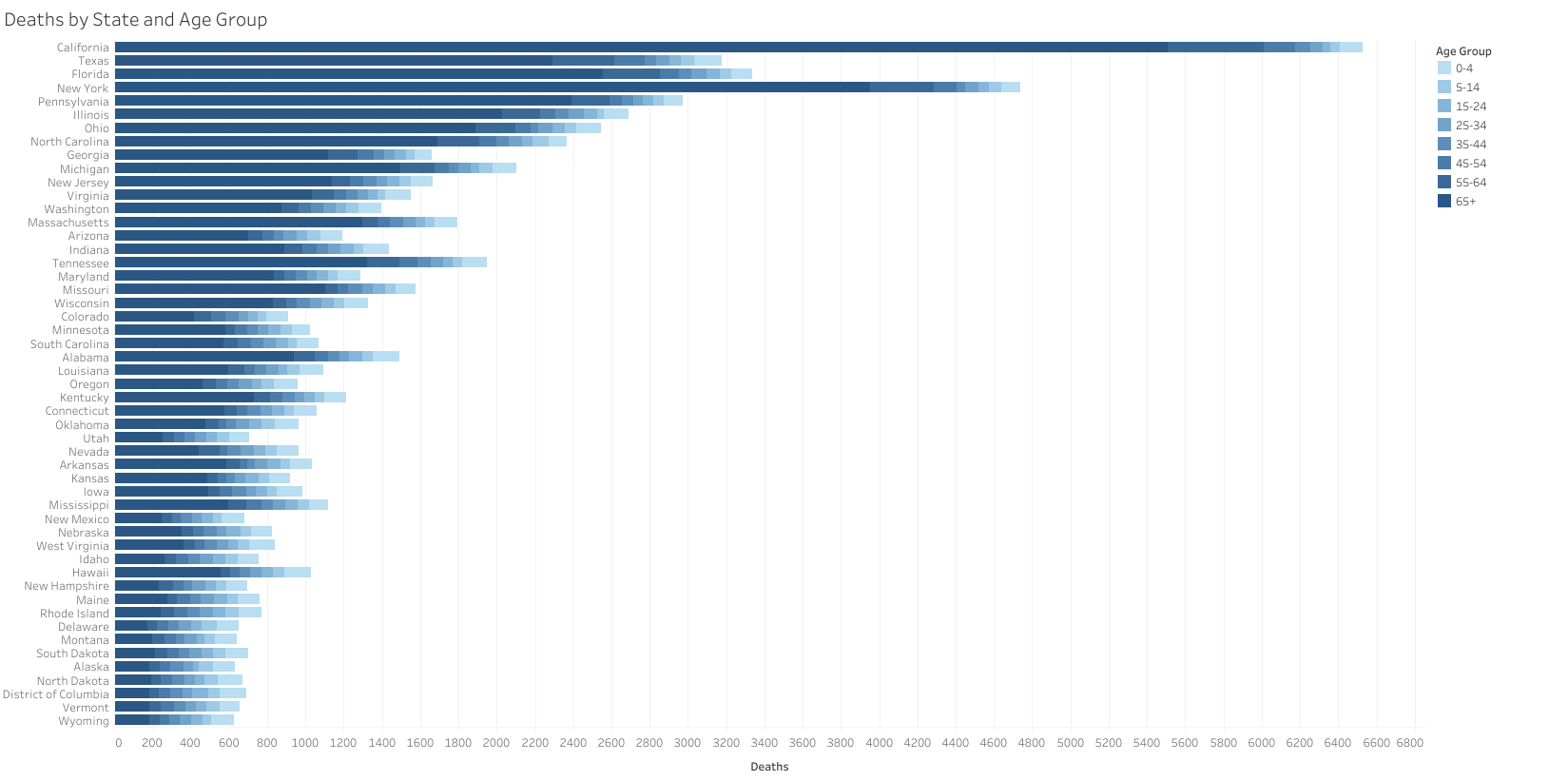 Visualising a breakdown of influenza-related deaths by age group and state confirms that mortality increases with age, despite relatively balanced age distributions.