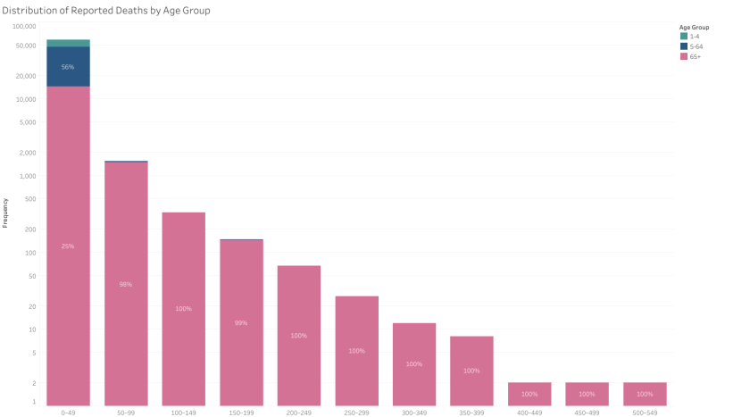 As weekly death counts increase, the proportion attributed to the 65+ age group rises sharply. In all weeks where deaths exceeded 100, older adults were responsible for nearly all cases, highlighting their disproportionate burden during periods of peak mortality.