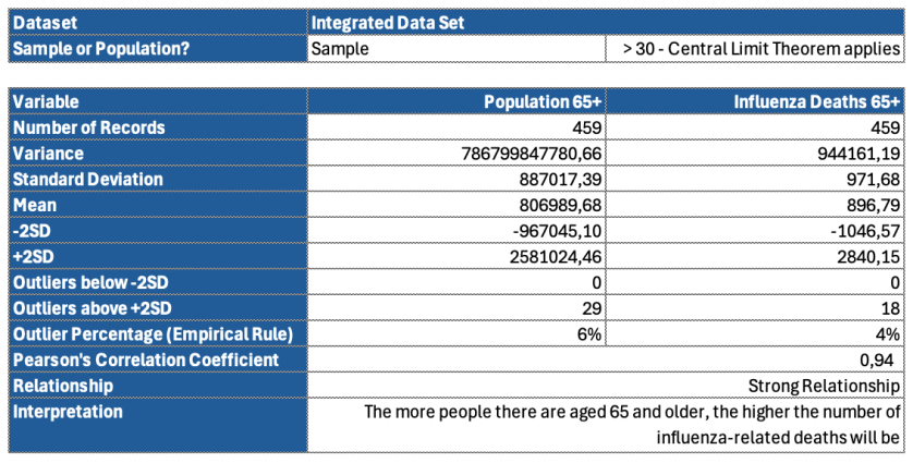 To statistically validate this relationship, a one-tailed two-sample t-test assuming unequal variances was conducted. The comparison of influenza-related death rates between individuals aged 65+ and those under 65 yielded a p-value of < 0.001. This result provided strong evidence against the null hypothesis, confirming that older adults experience significantly higher influenza-related mortality than their younger counterparts.
